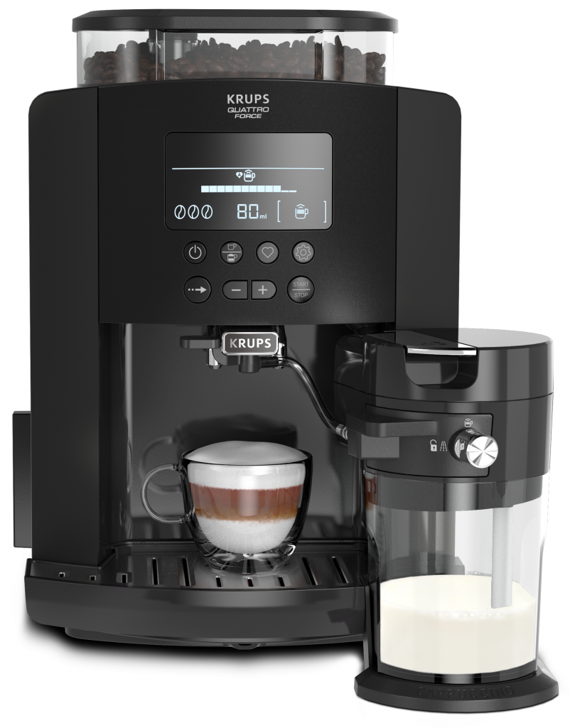 Кафеавтомата Krups Arabica Latte осигурява изключително качество и предлага резултати на ниво бариста за всички ваши любими напитки - от плътно RISTRETTO (ристрето) и LUNGO (лунго) до неустоимо кремообразно капучино. С опростения контейнер за мляко приготвянето на перфектното капучино е на една ръка разстояние. Големият LCD екран прави приготвянето на кафето изключително лесно за потребителя. Системата KRUPS Quattro Force придава изключителен вкус благодарение на технологията, проектирана за оптимално смилане, перфектно уплътняване, извличане на екстракта oт кафето и автоматично почистване.