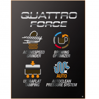 • Системата Quattro Force обхваща всяка стъпка за перфектно еспресо: предлага оптимално смилане, уплътняване, приготвяне и автоматично почистване.